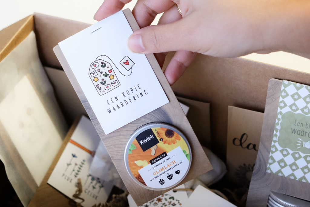 Wij laten je graag zien hoe mooi onze bedankjes zijn. Natuurlijk geeft onze webshop een goede indruk, maar we weten dat het lastig blijft om de echte beleving van een bedankje online over te brengen. Daarom hebben wij proefpakketjes samengesteld: een mooie doos gevuld met een groot deel van onze bedankconcepten.